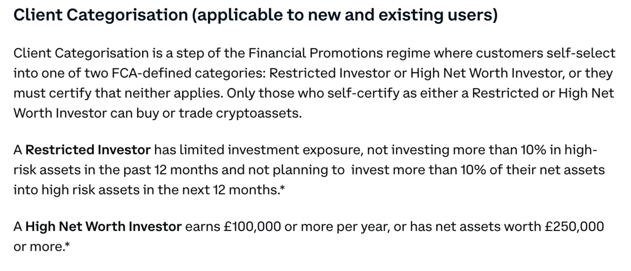 From personal experience, this involves every UK investor having to take a quiz on exchanges like Coinbase to determine whether they had enough understanding of crypto to be able to invest.